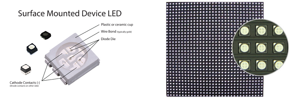 SMD technology is completely opposite of DIP technology. It doesn’t use three colors of LEDs (red, blue and green); rather, it makes a single point by grouping them. The resultant is either a dot or a square, where the dot has diameter of a few millimeters.